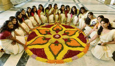 Onam is a 10-day harvest festival celebrated in Kerala in the month of August - September. The festival is celebrated with grandeur. There are fairs and contests for people to indulge in. The floors are decorated with flower designs.